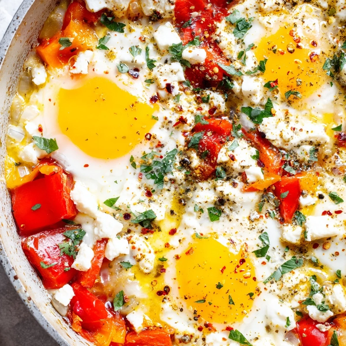 This dish combines creamy feta cheese with perfectly baked eggs, creating a rich and satisfying breakfast experience. The Mediterranean vegetables—diced tomatoes, red bell peppers, and red onions—add sweetness and depth, while garlic, oregano, and fresh parsley bring aromatic complexity. With just 10 minutes of prep and 18 minutes in the oven, you'll have a restaurant-quality meal that's both low-carb and vegetarian-friendly.