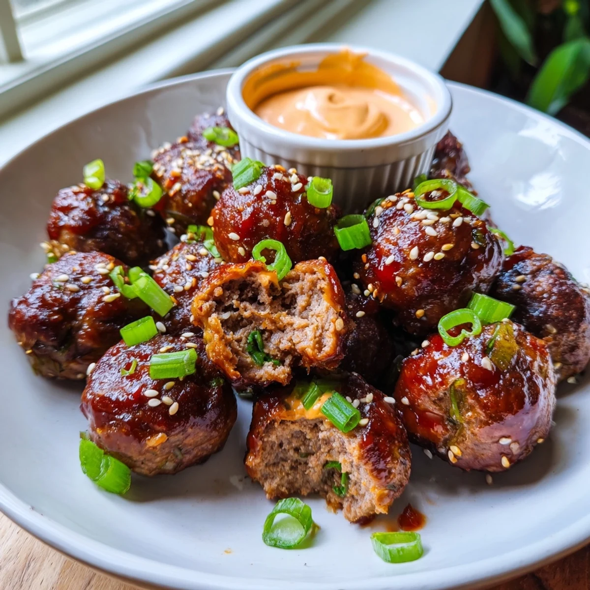 These Korean-inspired meatballs combine ground beef with aromatic garlic, ginger, and gochujang for a sweet and savory flavor profile. Baked to perfection, they develop a beautifully caramelized exterior while remaining juicy inside. The accompanying spicy mayo dip balances the rich meatballs with its cool creaminess and sriracha kick.